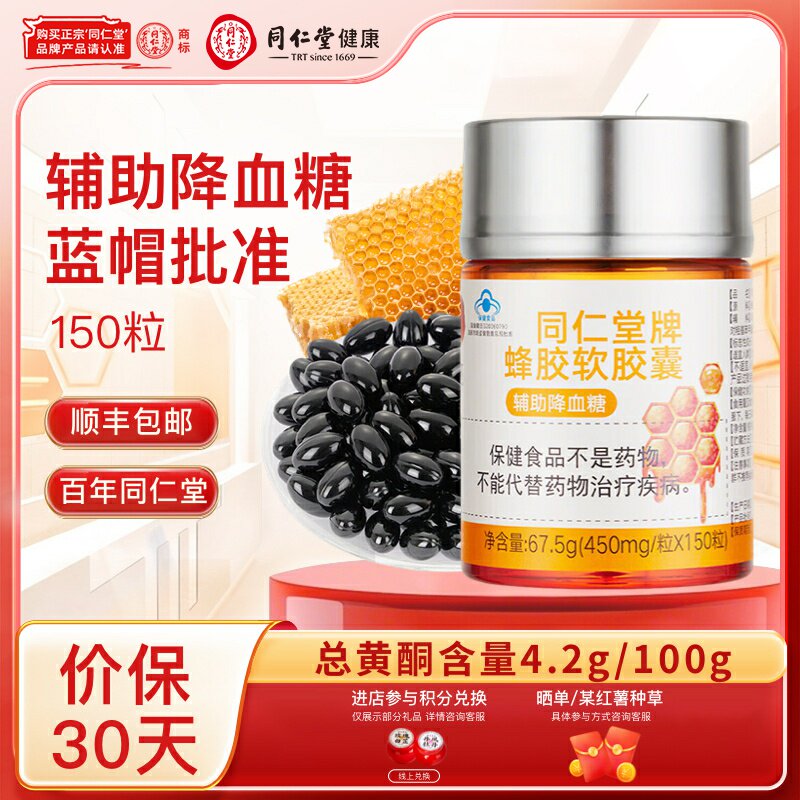 -> 北京同仁堂蜂胶软胶囊120粒/瓶 辅助降血糖偏高保健品 节日送礼品