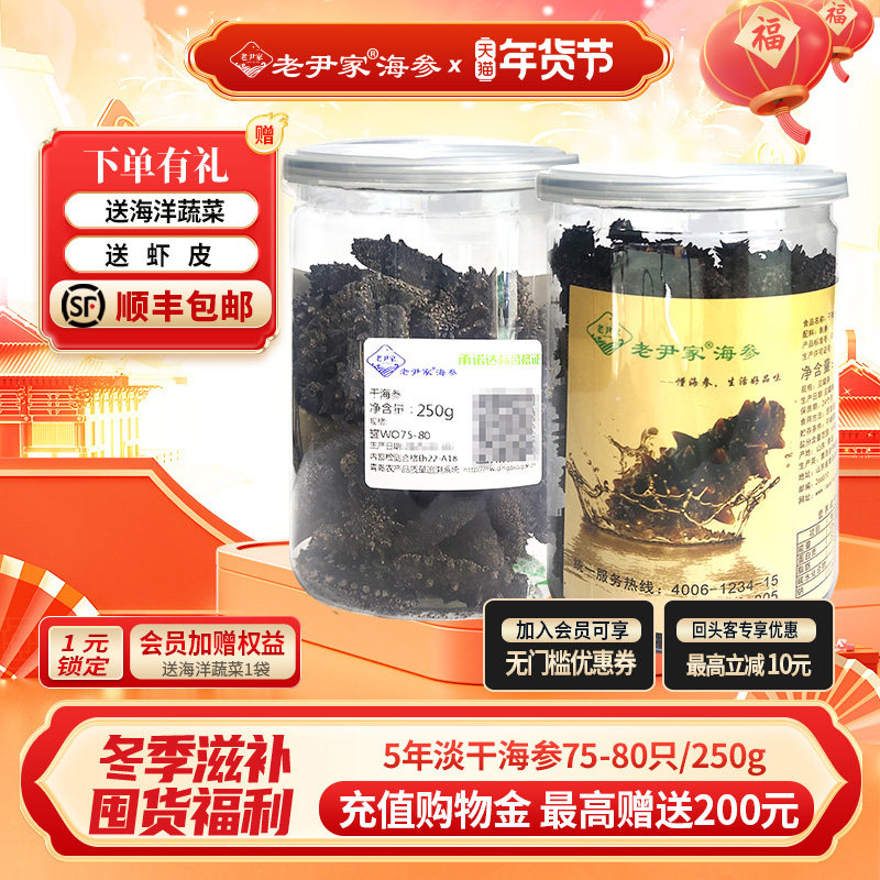 老尹家淡干海参底播5年冬季滋补礼盒罐装家庭自用款250g75-80头