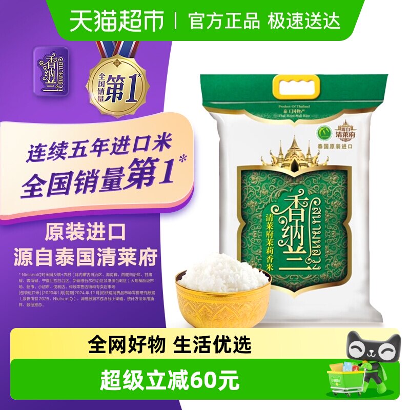 -> 香纳兰清莱府茉莉香米5kg*1袋泰国清莱府原装进口泰米