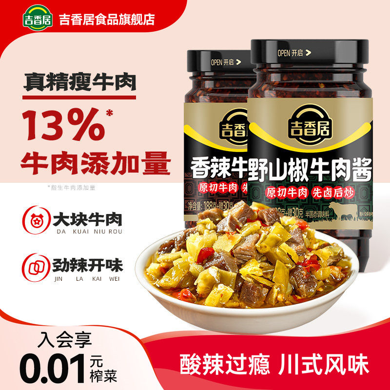 -> 吉香居野山椒牛肉酱218g红烧香辣牛肉酱拌饭拌面下饭酱四川辣椒酱
