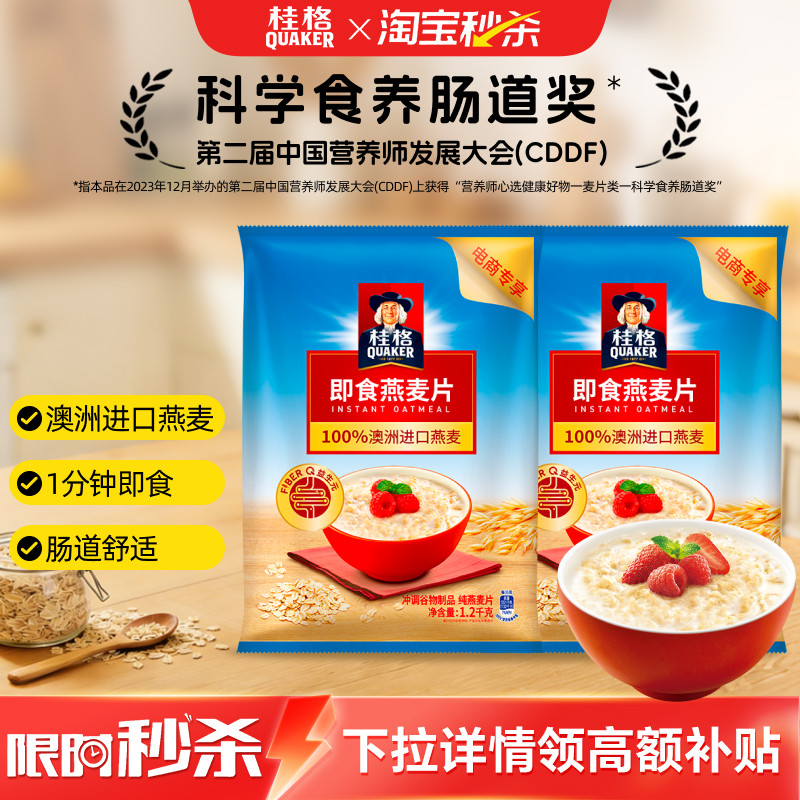 桂格即食原味纯燕麦片1.2kg代餐饱腹营养无白砂糖早餐谷物麦片