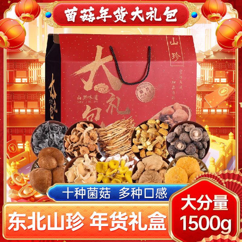 -> 东北山珍礼盒1500g黑木耳干货玉木耳榛蘑松茸香菇礼盒年货节送礼