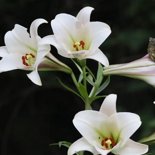1、外在感官特征:1.1、鲜花:花单生或2-4朵,花苞自然下垂;苞片矩圆状披针形,长5-6厘米,稍宽于叶,宽1.2-1.6厘米;花梗长可达6厘米,紫色;花喇叭形,有微香,白色,里面淡黄色,背脊及近脊处淡绿黄色,长12-15厘米;外轮花被片披针形,宽1.6-2.8厘米;内轮花被片匙形,宽2.6-3.8厘米,先端钝圆,蜜腺无乳头状突起;花丝长10-12厘米,下部密被毛,花药椭圆形,长约1厘米;子房圆柱形,长2.6-4.5厘米,宽4-5毫米,淡黄色;花柱长可达10厘米,基部有毛;柱头膨大,径8毫米,3裂。 1.2、鳞茎:球形,一般2-3侧生鳞茎,直径约3厘米,宽约1厘米,单个鳞茎重50-120克。茎形圆整,鳞片肥厚,抱合紧密。色泽褐黄色或偏紫白色,肉质脆嫩,微带苦。