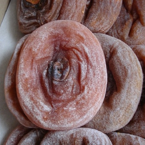 柿饼上的白霜是柿饼表面糖份自然糖化产生的,不是添加的。柿饼随着放的时间越长,生成的白霜越多,有种检测是否是真白霜的,舔一些白霜试一下是否立即就化掉,如果添加其他东西的话是不会融化的