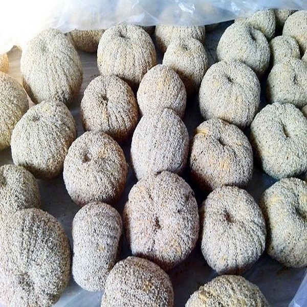 第六步,粘芝麻。把成型的糖瓜再放到出气孔周围,让成型的糖瓜有粘性,放入炒好的芝麻中,使其粘满芝麻,糖瓜就做成了。