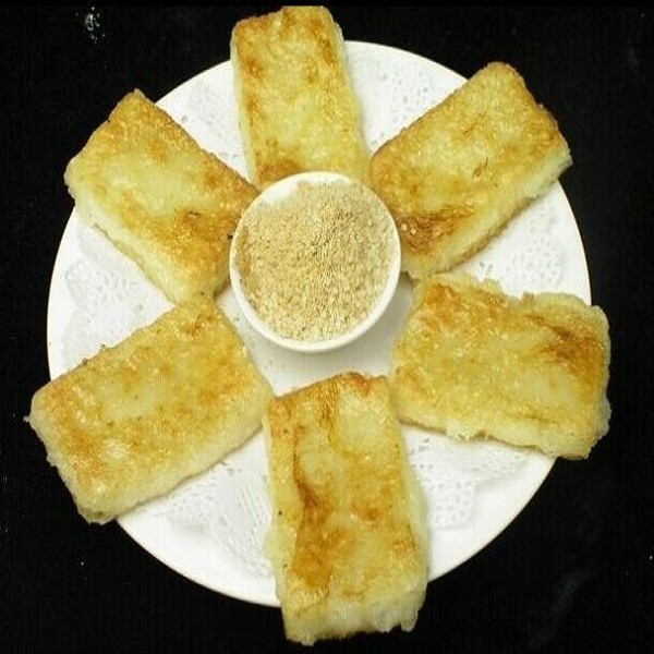 煎:在锅里放入底油,九成热后下糍粑,这时要把火转为文火,糍粑会在油煎的作用下慢慢变软,也开始变黏了,要注意噢,不要使糍粑相互粘在一起。一面发黄时就可以翻面,两面都煎好就OK了。