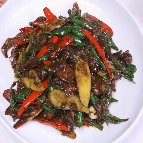 杀鸭时,先将鸭血流入醋加清水的酸水莱碗里,使其血浆不致凝固,然后将子姜、甜酱拌入血浆中搅匀,再将鸭子分档切成小块,用肥膘肉四至五两煎溶,将鸭放人铁锅中爆炒,再入辣椒、蒜拌炒闷熟,锅内无水时,把血浆拌料加味精倒人锅中,边倒边炒,待血浆成熟后,即或出锅上席食用