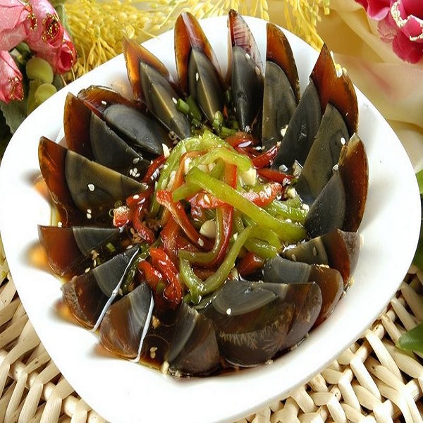 1、外在感官特征:蛋体透明, 有光泽,富有弹性;不粘壳,有小溏心、大溏心、沙心、硬心四种,蛋白呈半透明,墨绿色或茶褐色;松花明显, 图案美妙,似松柏盆景;蛋黄呈墨绿色,溏心蛋蛋黄油泣,硬心蛋蛋黄色层丰富;味美质柔嫩,近闻芳香, 食之爽口;钟祥皮蛋单个重70克左右;