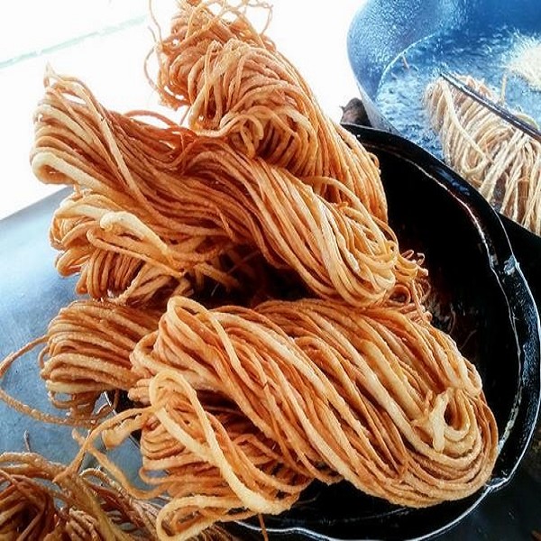 馓子色泽黄亮,层叠陈列,轻巧美观,干吃香脆可口,泡过牛奶后入口即化。