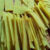 晒干:立秋前后晒笋最为适宜。开榨前必须看准天气,并在晒场上做好防雨准备。开榨后,取出压扁的笋,一片片滩在篾席或石块上。第一天晒出后,不要动它,晚间也不收,到第二天中午将笋翻晒。以后每天中午翻晒一次,晚上仍不收。到第五天,或笋半干时,将笋脑(头)压在笋尖上晒,这时每晚要收进,并将头、尖交错叠成长方形,再盖上木板。晒到九成干时(约7-8天),可以收进屋内,如前法堆放,用板压放二三天,使其回潮。然后再拿出去晒四五天,这样可使笋完全晒干。