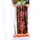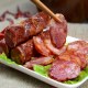 香肠的制作很有讲究,首先要选猪坐膀上的上等筋肉外加少量的肥肉,将精肉切成条状,和适量辣椒粉、食盐、五香粉、橘子皮等佐料拌在一起,用手反复揉搓,使佐料和精、肥肉融为一体,再将揉搓好的生肉灌进洗净的猪小肠中,一边灌,一边用筷子往肠子里扎,旨在将灌进肠子里的肉扎得严严实实。肠子灌完之后,每一尺左右,可以用绳子打一个结,以便悬挂薰烤。薰烤前,可以将灌好的肠子阴干两天,然后悬挂于火坑上面的横梁上,用柴火、锯木粉、花生壳、橘子皮等物细细薰烤,有条件的人家往往专门放上木炭在一个较为封闭的铁桶中细细薰烤,这样风味更好。薰烤半个月左右,一串串黄金亮色的香肠便制成了。