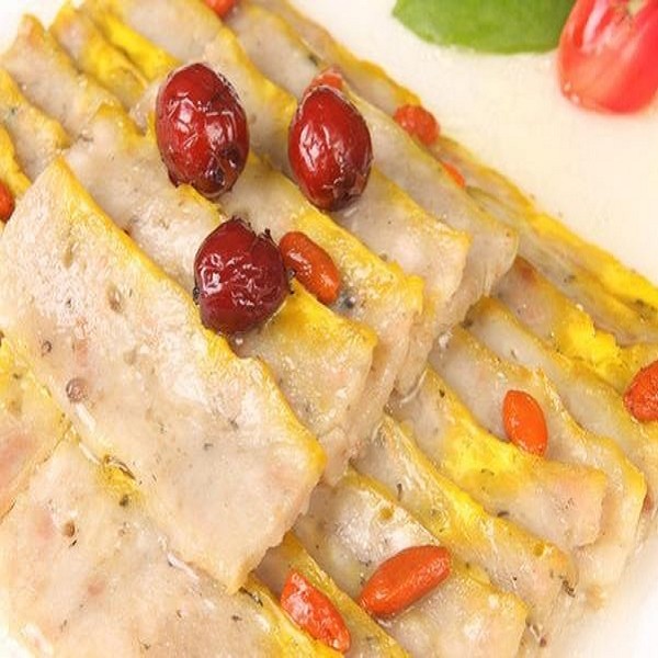 (3)将油豆腐皮平铺笼屉内,把鱼肉糊平摊在上面(约3.3厘米厚),坐旺火沸水锅上蒸30-40分钟,揭开笼盖,将生鸡蛋黄抹在肉糕上面,撒上红辣椒末,再蒸5分钟取出,剞成十字花刀后,继续蒸30分钟,出笼晾冷,切成10厘米长、3.3厘米宽的条。