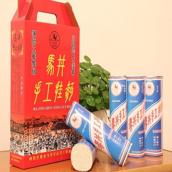 马井挂面,德阳地道土特产,早在民国时期,马井乡就有专营手工挂面作坊六、七家,其面质柔软、洁白,纯净无杂,根头细如银丝,匀称光滑,开水一烫即熟,久煮变不糊不腻,被誉为银丝挂面。挂面是在小麦粉上添加盐、碱、水过后,挂在竹竿上即干燥后切制成一定长度的干面条。