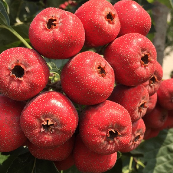 果实近球形或梨形,直径1-1.5厘米,深红色,表面鲜红有光泽,有浅色斑点,果肉薄,味微酸涩。果可生吃或作果脯、果糕。山楂果含有丰富的果胶,高达6.4%,排在所有水果之首。果胶,具有防辐射作用,还有吸附、抗菌功效。八虎山山楂由于独特的地理地质条件,含果胶更多。用这种原料做出的产品,富有弹性,凝固的好,不必再添加其他的胶类凝固剂,也减少了成本,保持产品的原味。果核小,数量3-5粒,外面稍具稜,内面两侧平滑。而且具有开胃、解腻,增强免疫力、抗疲劳、抗癌、降压、降脂等生理功效,既可生食,又可加工成果汁、蜜饯、脆片、酵素、速溶粉等产品,是总酸含量极高的原因。据中国药典1985版一部山楂项记载:“山楂‘消食健胃,行气散淤’”。营养、口感俱佳,风味独特,远远优于其他种植区同类产品。