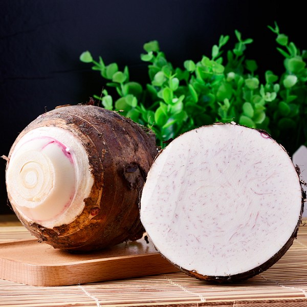 香芋外观圆柱形,表皮棕黄色,单个母芋重1000-2500克,最大达5000克。芋肉带紫红色槟榔斑纹,肉质细嫩、松酥可口、芳香气浓、味美独特,富含淀粉、蛋白质及各种氨基酸。